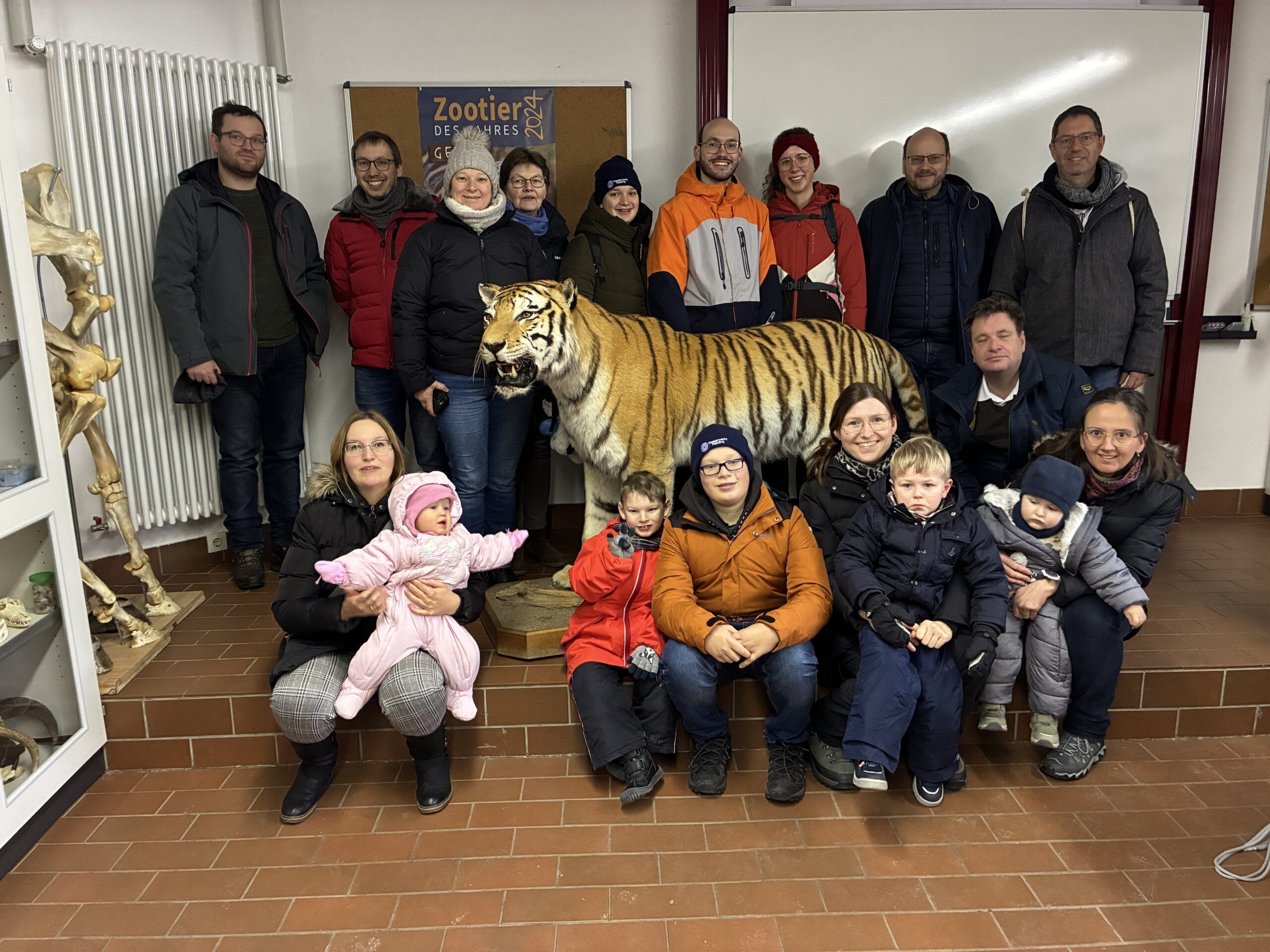 Am Tiergarten in Straubing angekommen, wurden wir gleich von unserer Zooführerin Ingrid Westenhuber begrüßt. Die Führung begann in der Zooschule. Hier waren viele Tierpräparate, Tierfelle, Geweihe und Informationen über die Tiere zu sehen. Als erstes wurde die Geschichte des Tierparks erzählt. Als vor fast 100 Jahren der Stadtwald mit dem Mooshäusl von vielen Straubingern gut besucht wurde, hatte der damalige Oberbürgermeister die Idee, Gehege mit Tieren anzulegen. Der nächste Punkt der Führung waren Biber, Otter und Geweihe. Die Fragen der Zooführerin konnten die Wasserwachtler durch ihr große Wissen alle beantworten. Nach einem Gruppenbild mit dem Tiger ging es weiter in das Außengelände. Vorbei an den Greifvögeln wie den Bartgeier ging es dann in Richtung Bären, die im Moment Winterruhe hatten. Weiter ging es dann zu Esel, Wisent und Trampeltieren. Hier wurden erklärt, warum ein Trampeltier nicht über den kleinen Bach, der als Abtrennung zu den Besuchern dient, laufen kann. Anschließend wurden Tiger, Löwen und Fuchs beobachtet. Hier folgten interessante Infos über die Tiere. Ebenso erzählte Zooführerin immer wieder von Begebenheiten im Tierpark, die sie selbst erlebt hatte oder die sich zugetragen hatten. Mit einem Applaus der Gruppe und einem Jahreskalender der Wasserwacht vom Bereich Naturschutz, den Jürgen Tauer jährlich selbst erstellt, bedankte sich Naturschutzwart Schramm von der Zooführerin. Nach der Führung konnte jeder selbst noch durch den Tiergarten schlendern und an dem einen oder anderen Gehege die Tiere weiter beobachten.